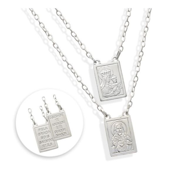 ESCAPULÁRIO DE PRATA SAGRADO CORAÇÃO JESUS E NOSSA SENHORA DO CARMO 60CM