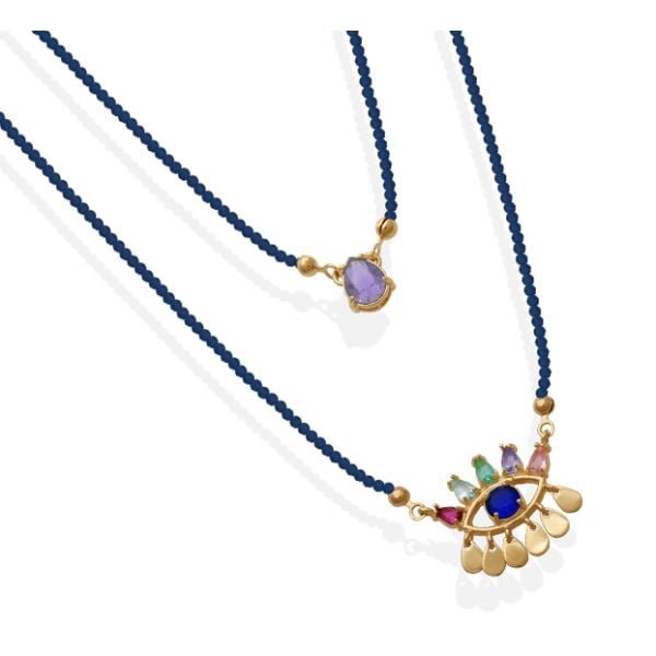Escapulario Miçangas Azul Com Olho E Gota Em Pedra Rosa