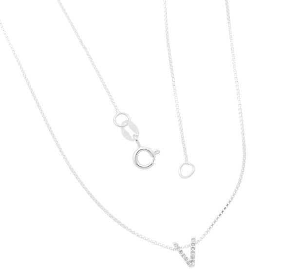 Gargantilha De Prata Com Pingente Letra V Pequena Cravejada 45Cm