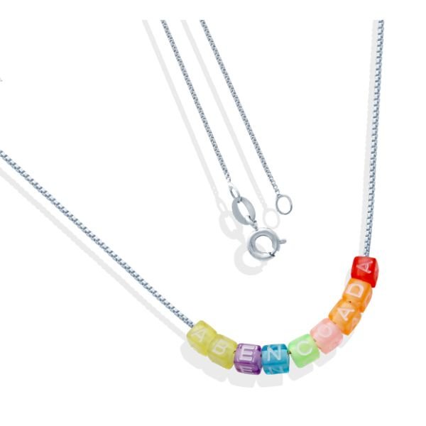 Gargantilha De Prata Veneziana Com Cubo Acrílico Abençoada Colorido