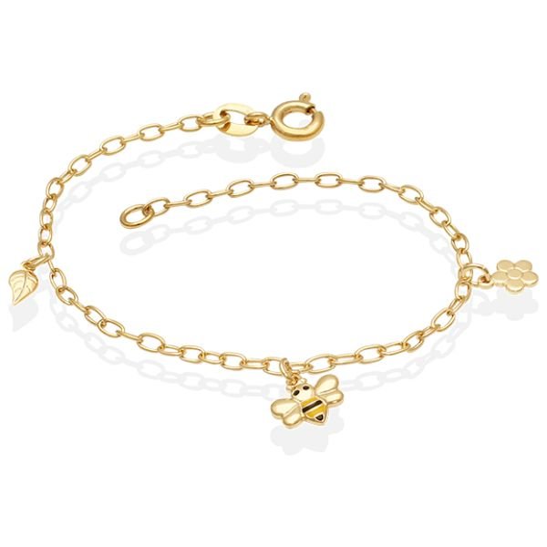 Pulseira Cadeado Com 1 Folha 1 Flor Reta 1 Abelha Com Resina Amarela 18Cm