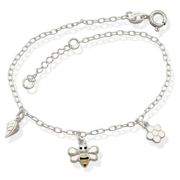 Pulseira De Prata Cadeado Com 1 Folha 1 Flor Reta 1 Abelha Com Resina 18Cm