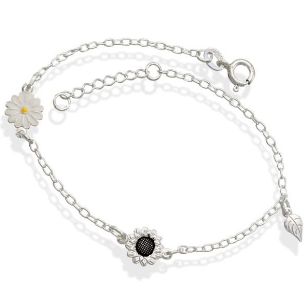 Pulseira De Prata Com 1 Folha 1 Girassol 1 Margarida Com Resina 18Cm
