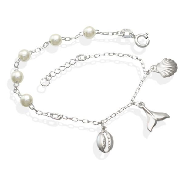 Pulseira De Prata Com 5 Pérolas Com Concha Rabo De Sereia Búzio 18Cm