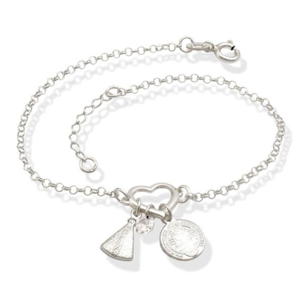 Pulseira De Prata Coração Vazado Com Zircônia São Bento Aparecida 18Cm