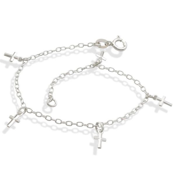 Tornozeleira De Prata Cadeado Elo Longo Com 5 Cruz Facetada 23Cm