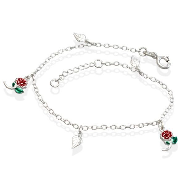 Tornozeleira De Prata Com 3 Folhas E 2 Rosas Com Resina 23Cm